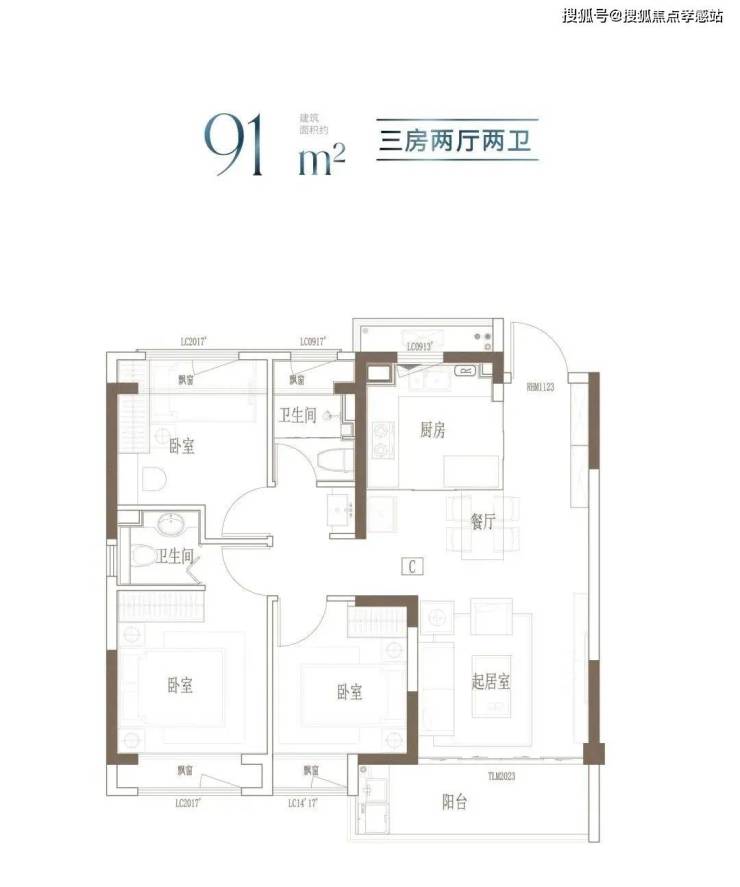 建面约91m²的这个户型,3开间朝南,全屋阳光充足;L型厨房转角移门设计,最大化空间视野;四飘窗设计,通透空间享受;动静分区,亲密有度;套房式主卧,容纳私谧生活点滴。