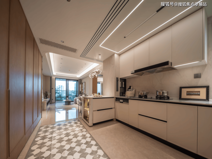 其一,半开放式厨房,结合客餐厅阳台一体化设计,当你站在厨房,视线无遮挡直接触达阳台,甚至直抵外面景观。
