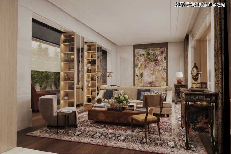 客厅,也是一处流动的空间,通过“自由灵活的组合”营造不拘束的社交空间,家具摆放,连而不挡,分而不隔。满目吸睛的艺术品,错落布置的家具,丰富着空间的视觉层次。