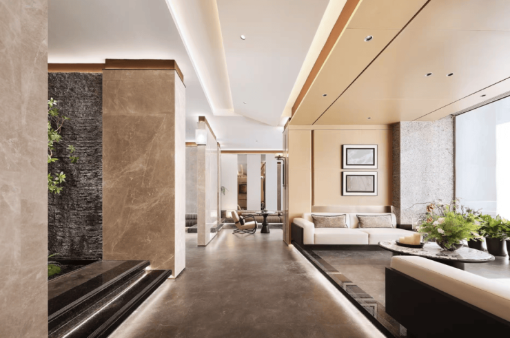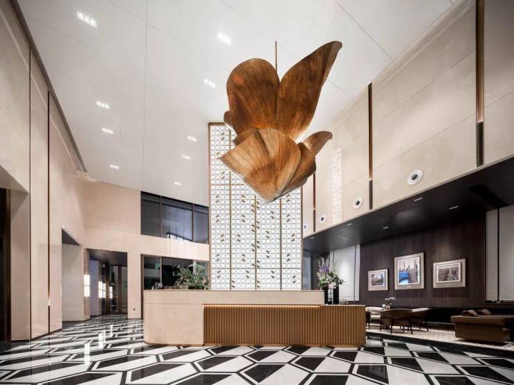 一路往里走,首层大堂与电梯厅的“梵高印象岩板”共同构成了充满现代艺术张力的视觉盛宴。