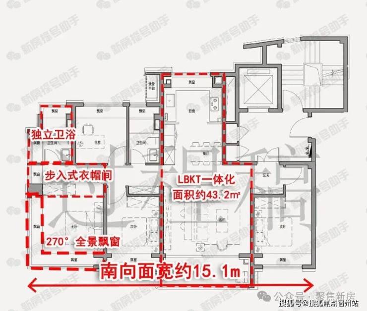 1、空间革新:四开间朝南,南向面宽高达约15.1m,采光面充足,景观视野开阔!LDKB一体化设计尺度奢阔!面积达约43.2㎡!超广阳台采光及通风效果MAX!年轻父母用嵌入式烤箱准备Brunch,老人在阳台晒太阳听鸟叫,孩子趴在腿边畅想未来