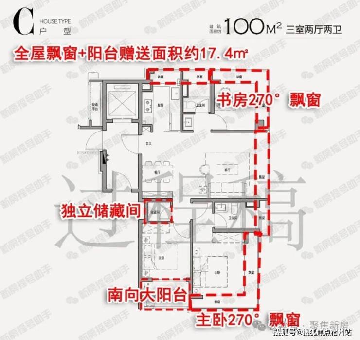 3、空间升级:超配双270°飘窗格局!市面上很少会有主卧及书房均设计270°飘窗的百平户型,稀缺性不言而喻~