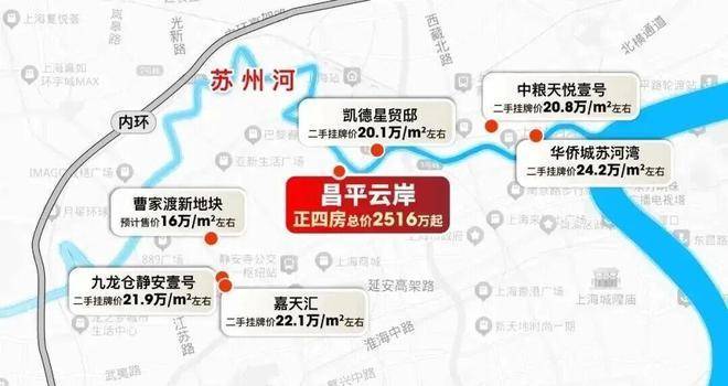 昌平云岸地处老静安内环内核心区位,隶属上海中央活动区(CAZ)。项目东临苏州河,是真正的一线苏河景住宅,拥有“苏河第一城市界面”的美誉。