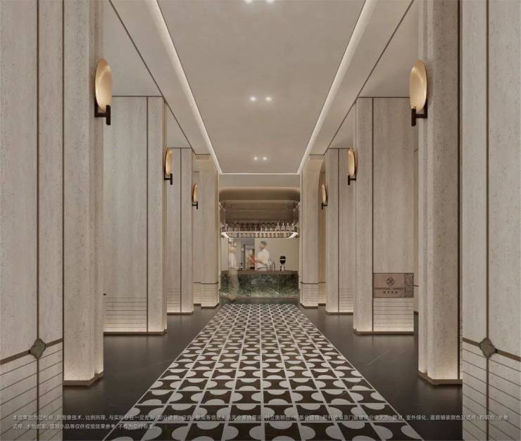 环岛式落客门庭:以宏大空间与沿街展开面,运用石材、金属、奢石、拼花等元素,将海派基因细腻复刻入内里,构筑令人瞩目的城市界面。