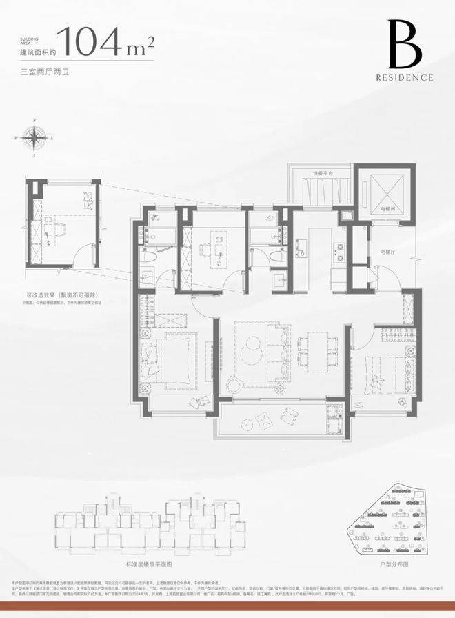 建面约104㎡3房2卫: