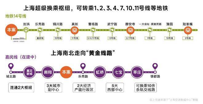 交通能级不断跃升:14号线和嘉闵线(在建中)双轨交汇,步行约200米14号线地铁口,14号线为高能级地铁线,5站普陀,30分钟直达静安,且始发有座,出行舒适;黄金走廊嘉闵线加速建设,约3站虹桥枢纽,未来可速达七宝、徐家汇、莘庄等核心区域。项目周边开泰路即将建成,绿野谷二期路段、骏达路、童家桥路、昌瑞路、涟澜路已启动建设,预计2026年建成。