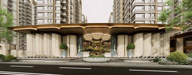 项目采用经典三段式立面美学,以竖向线条构筑挺拔轮廓,辅以香槟金铝板等材质,呈现出现代摩登的质感。