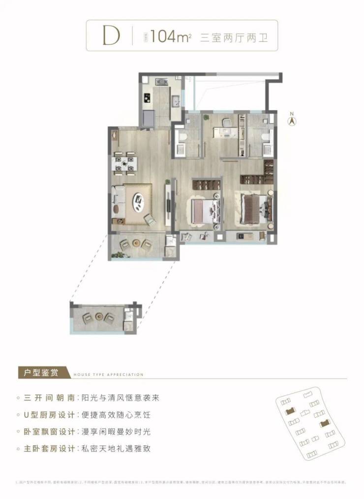 建面约104㎡3房2厅2卫,中间套D户型,做到了三开间朝南+主卧套房设计+朝南卧室带飘窗+动静分离,采光和通风俱佳。