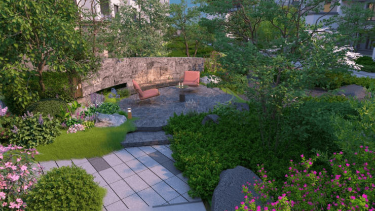 在园林设计上,以朱家角古镇为参考,以水系筑园, 整体布局采用“一湖·两园·两轴·八韵·十二境”,依托天赋自然资源,形成各个主题不一,层层递进,既独立又互相联系、互相渗透,将自然融入居所,打造城市瞩望的江南美学景观。