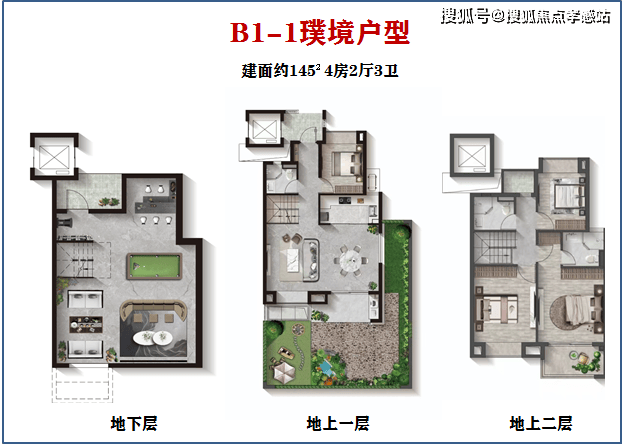 面积上与B1-1户型相同,建面约145㎡,功能区也大致相似。