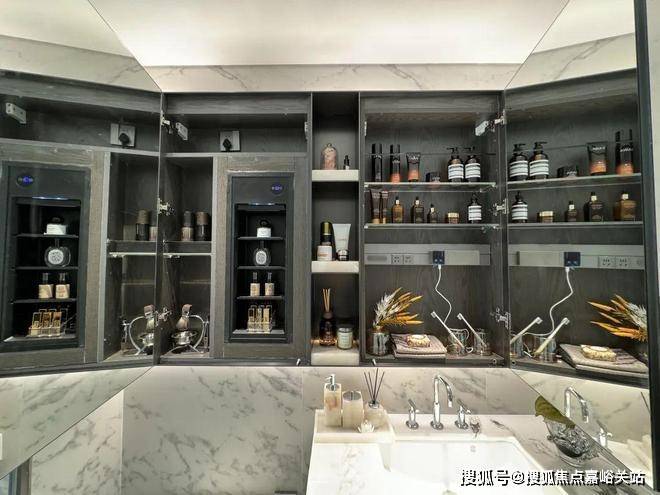 双卫配置,其中一个做了干湿分离,科勒台盆+双智能马桶+高仪花洒,除雾镜柜均内置了牙刷消毒器、预留吹风机插座。主卫镜柜还有美妆冰箱,收纳空间相当充足。