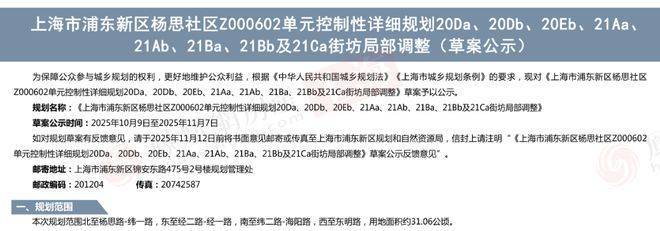 近日,《上海市浦东新区杨思社区Z000602单元控制性详细规划20Da、20Db、20Eb、21Aa、21Ab、21Ba、21Bb及21Ca街坊局部调整》草案正式公示。