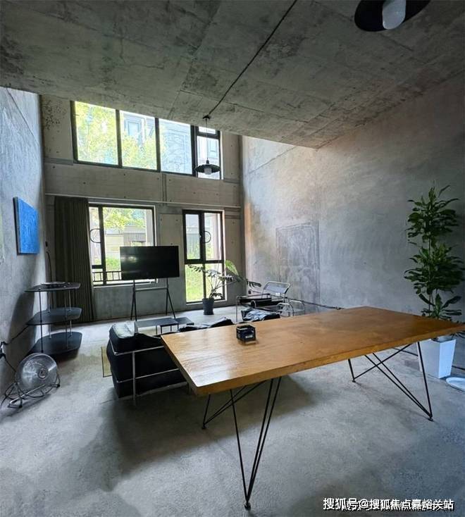 而从这里,也可以一览家中餐厅、客厅和头顶隔层空间的水泥毛坯风格,因为是复式,看起来还有种开扬宽敞的感觉。
