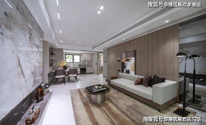 客厅背景墙岩板,客厅采用金属踢脚线,提升整体质感;