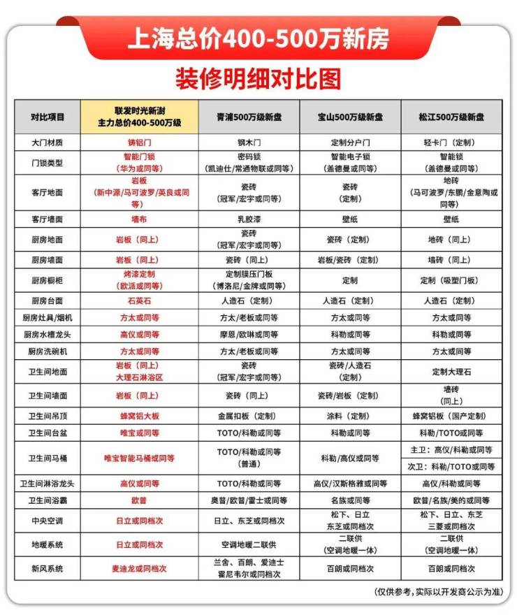 我把各区目前四百万比较热门的新房的装修标准做了横向对比: