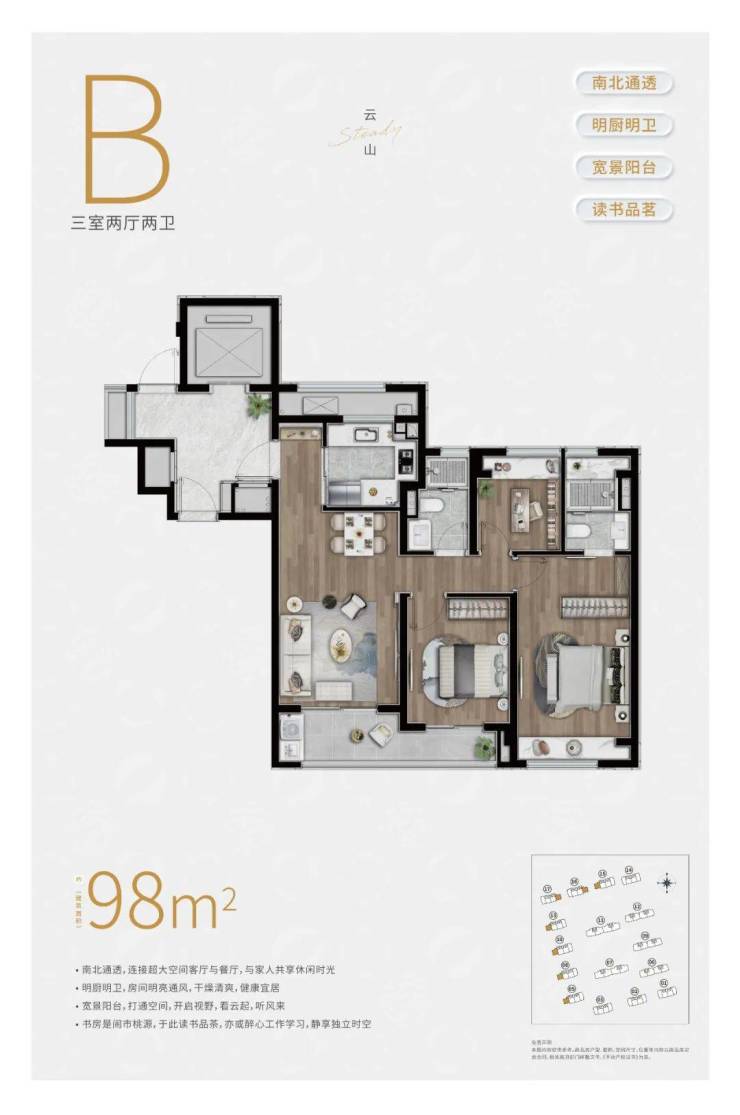 约98㎡3房2卫户型,三开间朝南,并且这贯穿客厅+次卧的超大阳台实在是惹眼,这个南向的视野延展度以及采光度相比同级别的户型来说,要更加出色。