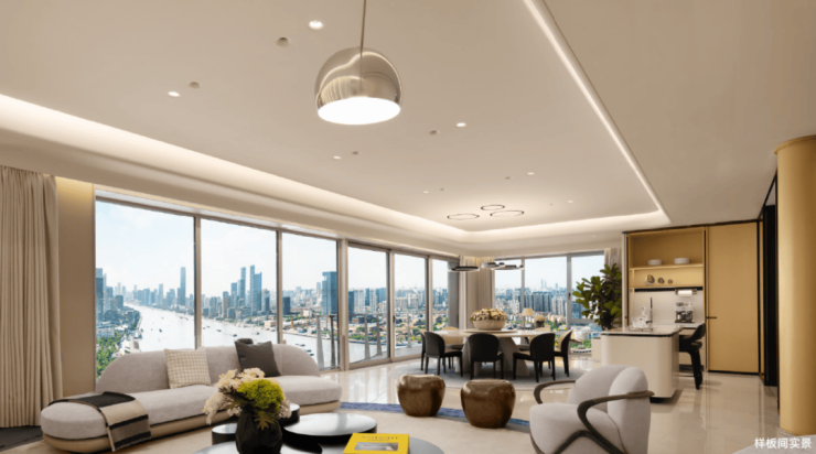 产品力直接拉满:约9.65米的超大客厅面宽配蝶翼双阳台,往西看陆家嘴摩天天际,东赏百年码头的人文底蕴,北望黄浦江的江景,转个圈三面都是景;餐客厨书房一体化的设计,家庭聚会、商务宴请、自己安静看书都能适配;约3.5米的层高通透开阔,两梯两户加礼仪玄关,隐私感和尊崇感都给足了。