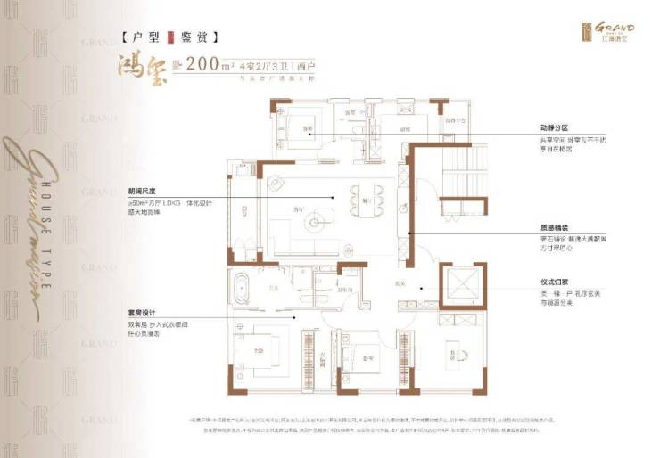 建面约200㎡4房2厅3卫户型,做到了三开间朝南+主卧豪华套房设计+南北通透,保证每个家庭成员都能有自己独立的居住空间,私密性拉满。