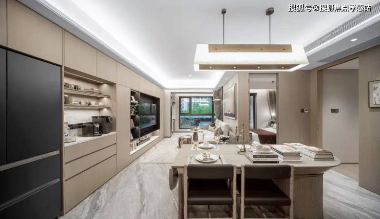 LDK客餐厅空间布局, 客餐厅一体+半开式厨房,客厅西侧灵动空间可以根据主人爱好改造,双阳台设计让室内采光、通透性俱佳。💖 四季都会ʚɞ官方售楼处热线:400-9966-940⚡ ꦿ℘