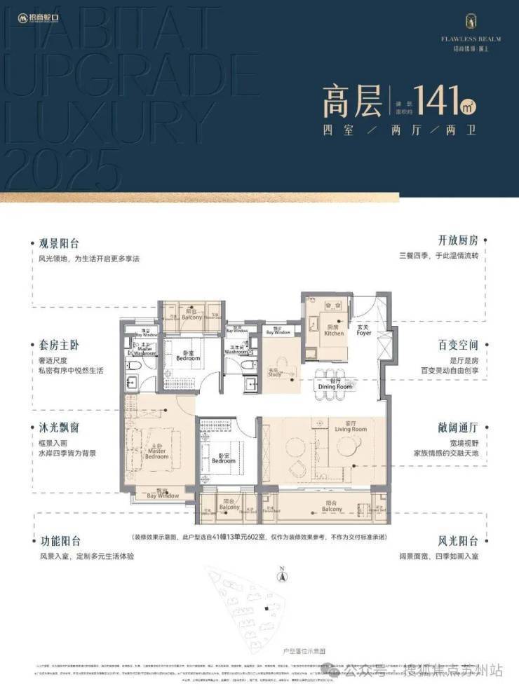 其中建面约141㎡户型优势突出!直面社区景观中轴,且整个西侧中高区看滨水+百万方城市公园景观无遮挡!景观视野满分!(公园为项目红线外设施,最终以政府审定以及实际建成为准,开发商不作承诺。)