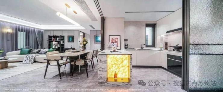 创意展示空间处处展现了海派风韵,例如更耗时更费钱的带弧度的半圆形吊顶!以及厨房的三轨道移门的水波纹玻璃,更具奢华腔调!