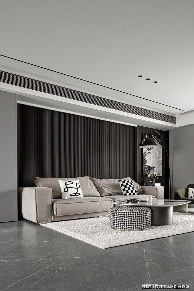 双层吊顶设计,巧妙地赋予了空间更丰富的层次感。客厅沙发的背景墙采用灰色硬包材料,点缀金属线条,简约中透露着大气与优雅。