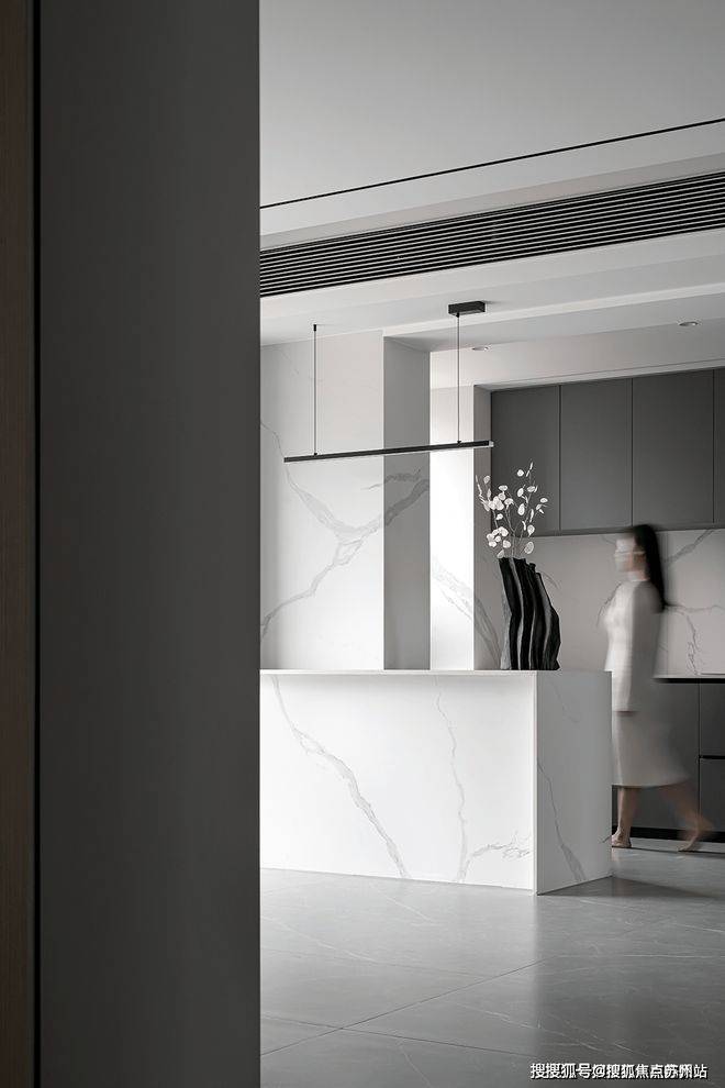 The fusion of the dining room and the kitchen presents a harmonious atmosphere, with built-in lockers and open kitchen design, making the whole space smooth and natural, spacious and bright. During the meal, through the French window, indulge in the beautiful scenery outside the window, as if it is a kind of enjoyment of dialogue with nature.