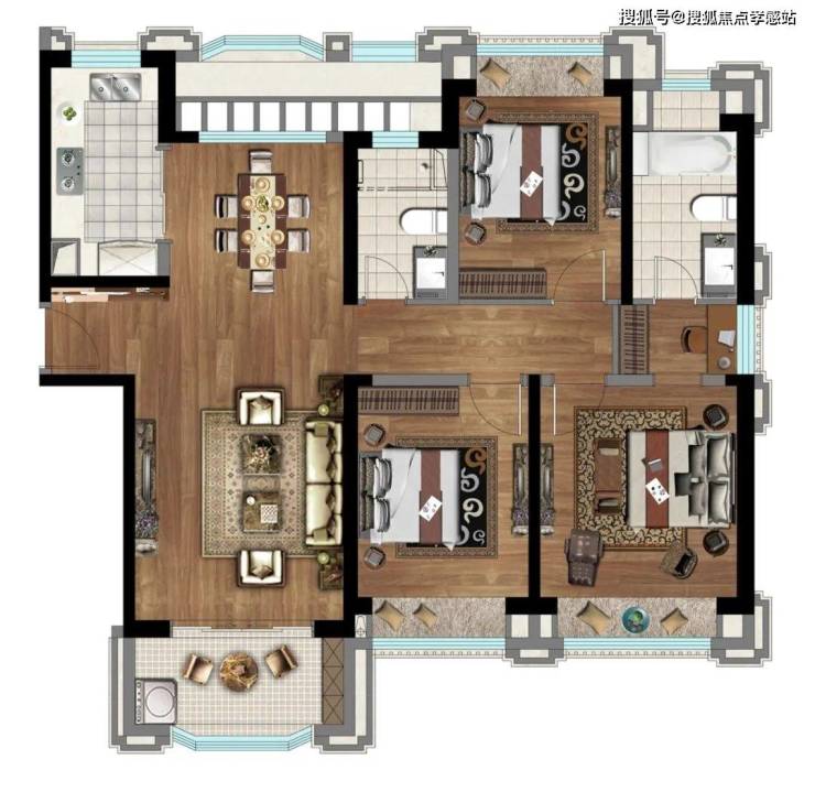 建面约95㎡2房,创新户型,全明设计。在一体化设计的客餐厨阳台中,一家人平时聚在其中,无论是坐在沙发上歇息、在厨房中烹饪、在饭桌上吃饭,窗外的风景都是生活的点缀。