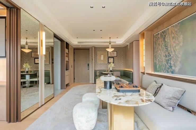 🔥保利光合上城售楼处电话:400-8787-740👈🔥公区设计方面,该户型实际是南北动静分区的设计,南面主次卧休息区域,北面客厅联通餐厨区和水吧台,格局相当方正,避免了面积浪费,也让视野几无遮挡,进门就能感受到大宅气度。