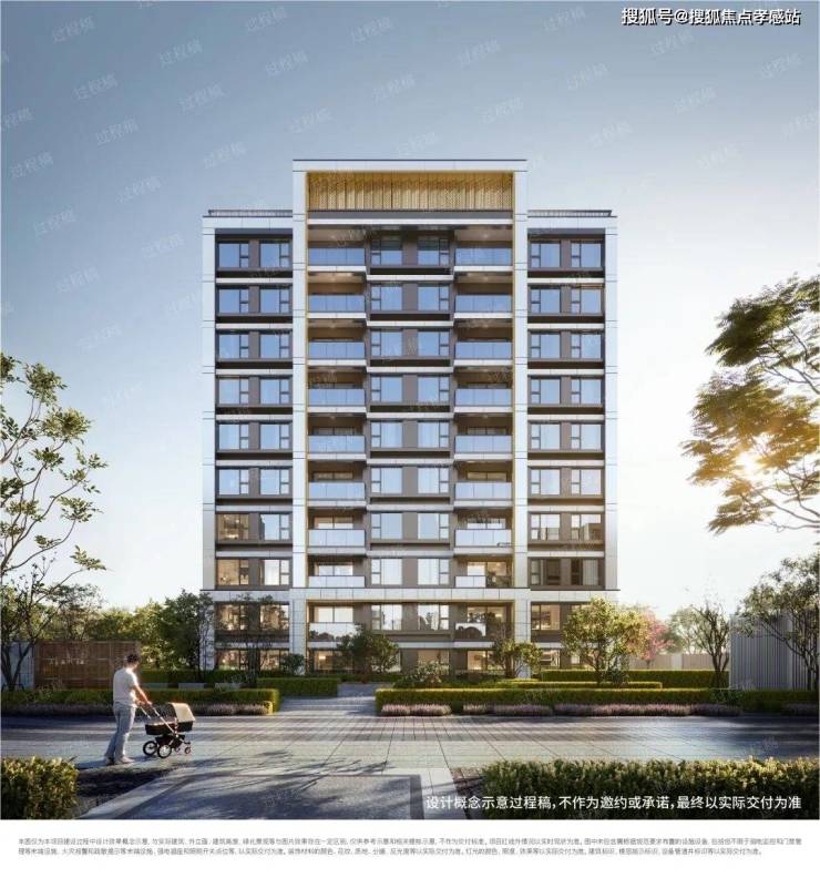 项目外立面采用现代简约建筑风格,点缀金色的框线,极简优雅但又不失格调,符合小区所在莘庄商务区稀缺核心住宅的定位。