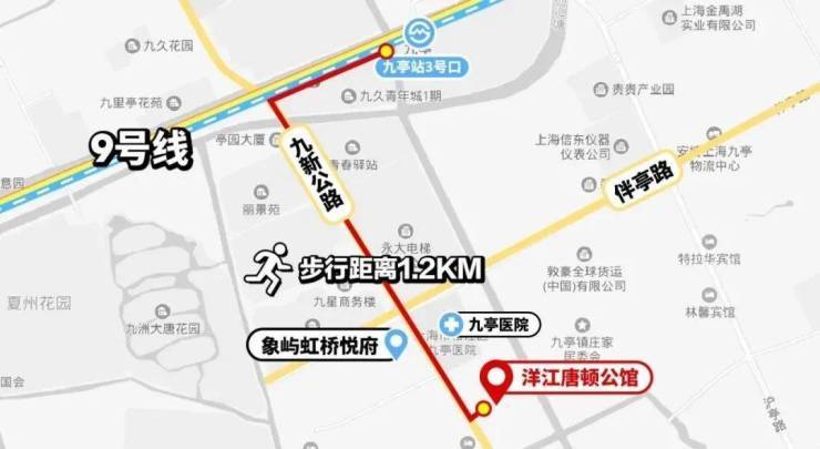 洋江·唐顿公馆直线距离九亭站约800米,实测步行约1.2公里,是当下离地铁站较近的新盘。