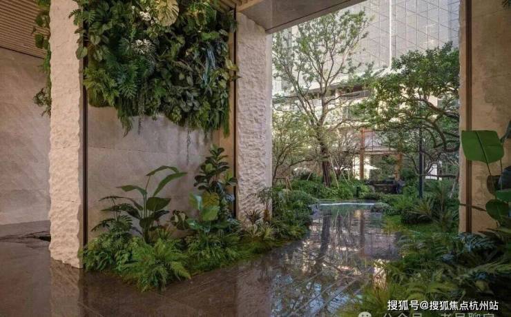 藤蔓沿墙垂落,水流自然流入,花草在架空层间摇曳生姿,使这一开放场域成为生机盎然的灵动空间。