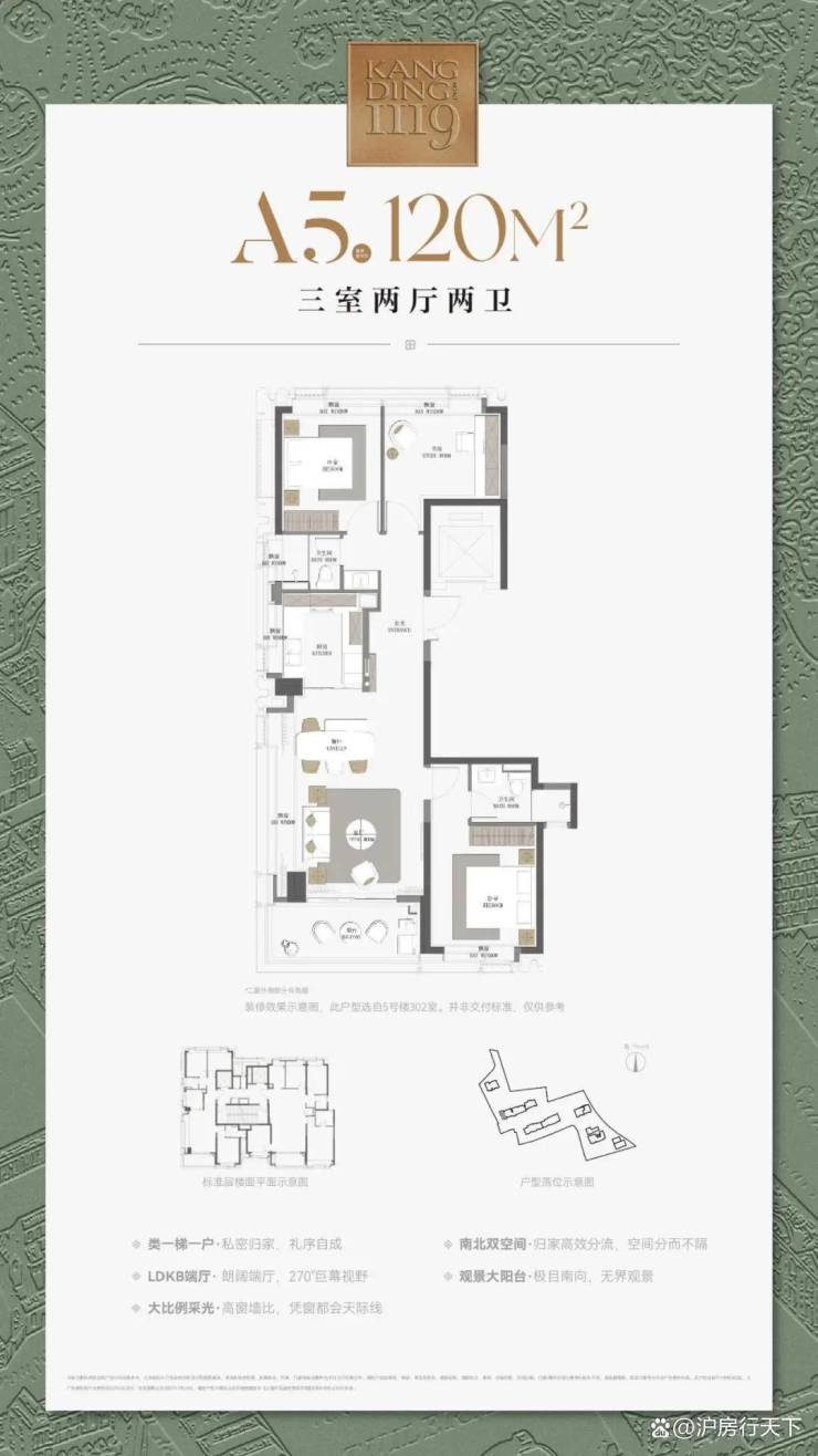 120㎡三房:三开间朝南,四开间南向面宽达12米,主卧带有270°转角飘窗,采光极佳。北次卧可根据需求改造成书房。独立电梯厅可拓展为2.7米收纳空间,LDKB一体化厅面积达38㎡,空间开阔。