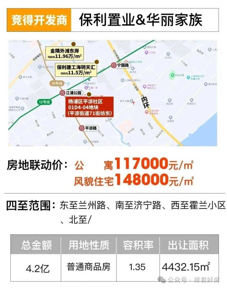 2023年12月5日,杨浦区平凉社区01D4-04地块(平凉街道71街坊东)以底价出让,华丽家族和保利置业联手拿下。该地块容积率1.35,小洋房联动价11.7万/㎡,风貌别墅联动价14.8万/㎡。