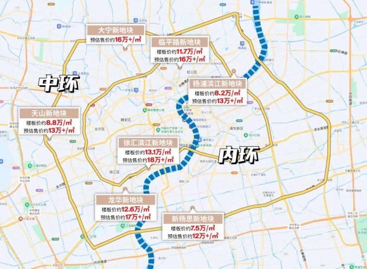 当然,还有核心城区:约12.6-13万楼板价的徐汇滨江、溢价率约38.2%的临平路、溢价率约40%+装修上限的新杨思...