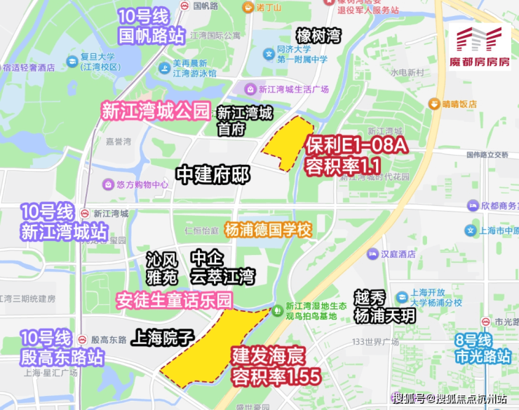 本次保利发展项目所在的E1-08A地块,容积率1.1,两面环水,毗邻城市副中心五角场。