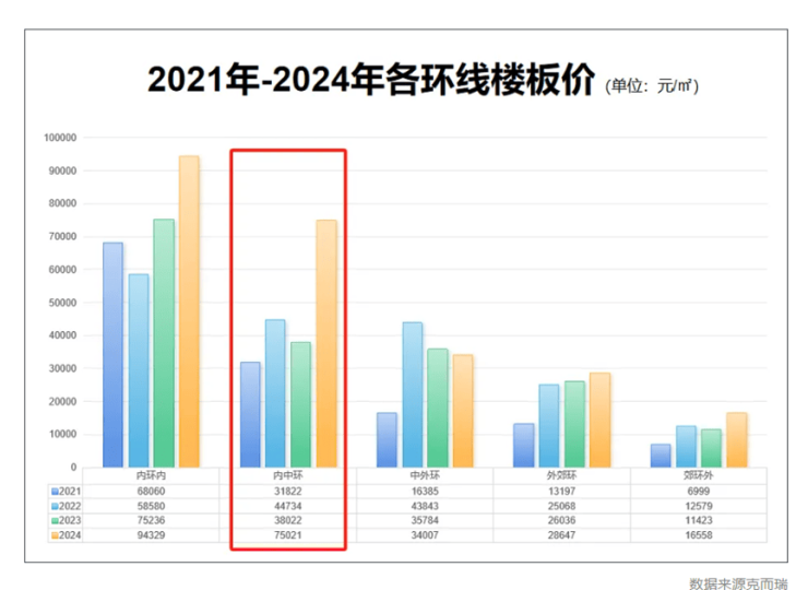 从2024年开始,上海各环线宅地的起拍/成交楼板均价,明显上涨,区域地王层出不穷,尤其是中环以内,地价同比涨幅接近翻倍。
