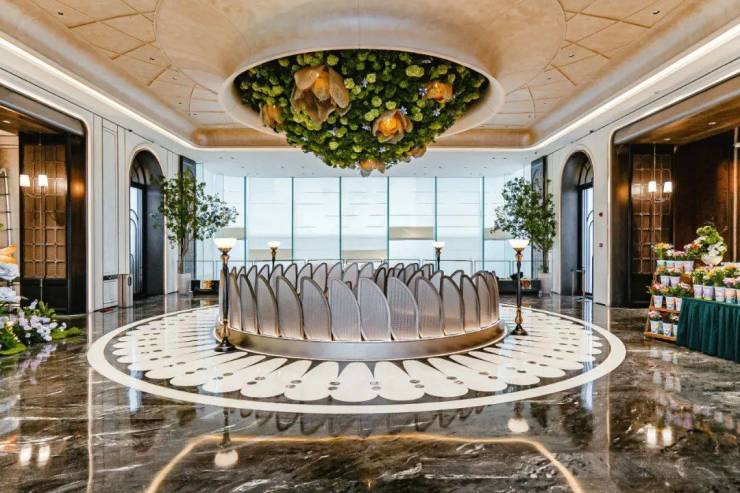 进门之后,恍若走进一幅立体绽放的画卷。地面采用了石材拼花,纹理如行云流水般舒展,在光影交错间勾勒出 低调的奢华。