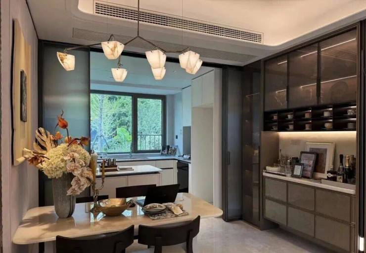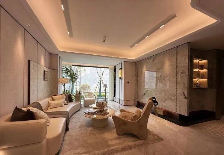 约5米面宽横厅,多出来一个灵动空间,可根据个人需求定制为开放式书房、茶室等;岩板+金属饰面电视背景墙同样为交付标准;