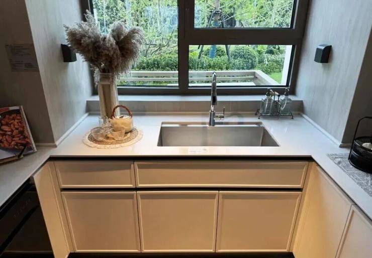 同时厨房也附赠飘窗,将飘窗台面与橱柜一体化设计,做为了水槽区域,极大的提高了厨房空间的实用面积!