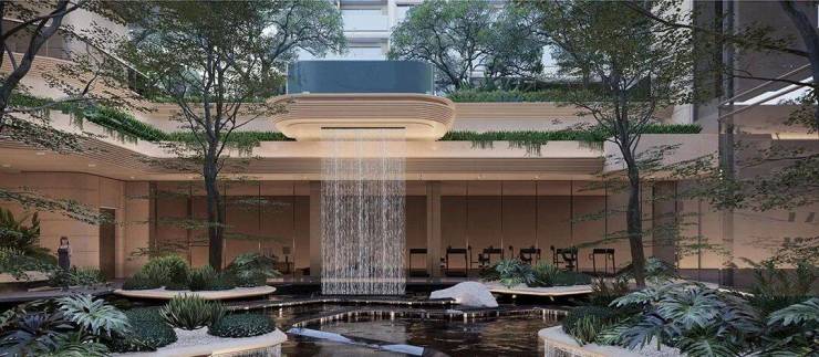通过多层次、立体化的景观营造,创造一座“漂浮的绿洲”,九重层次下沉庭院,区域悬浮泳池+4.3米飞瀑设计,塑造极致度假感受,丰富的视觉奇观。