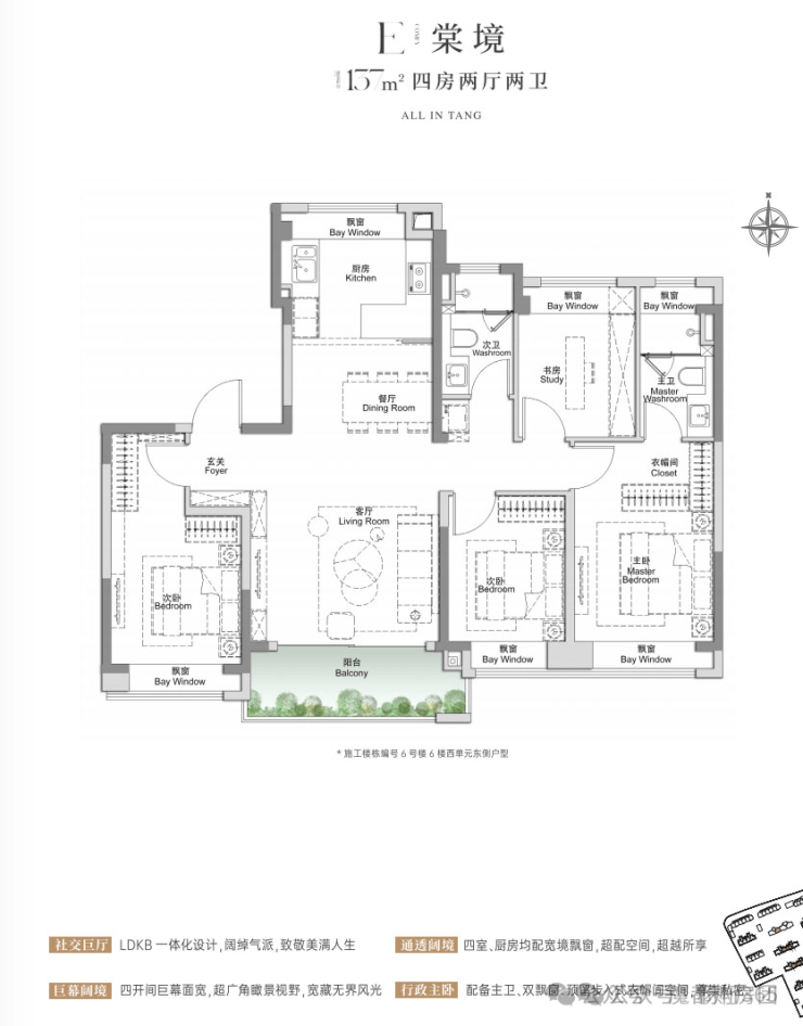 建面约105㎡3房2厅2卫,做到了三开间朝南+4个飘窗+双面阳台系统+主卧套房设计+270°转角飘窗,该户型的居住体验、舒适度、尺度感,是同级别产品所无法比拟的。