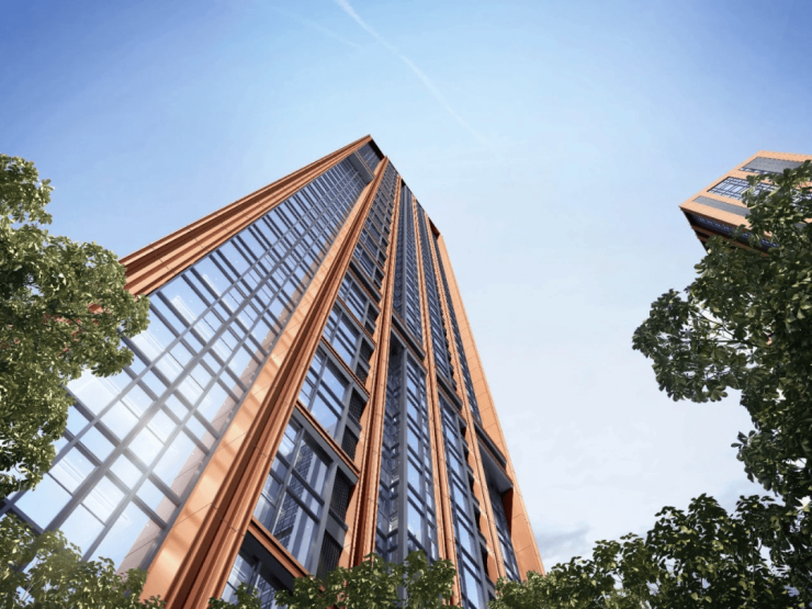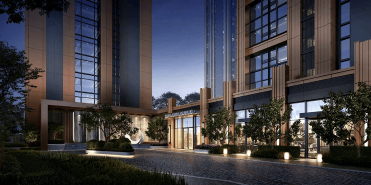 项目外立面选用低饱和度的橙色和深灰色作为主基调色,使用复合铝板结合深灰色门窗线条,简约高奢的风格更能历久弥新。
