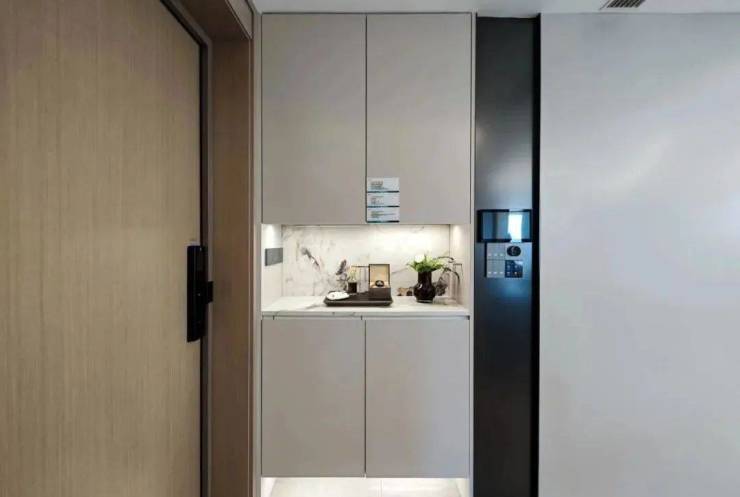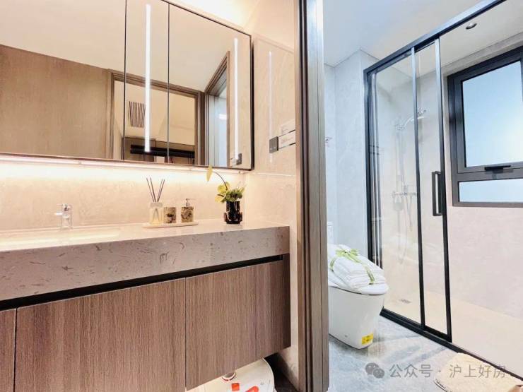 在细节上同样不遗余力。比如入户后的玄关柜是交付标准,打开厨房柜体、镜柜等各类收纳空间时均有惊喜;再如客厅和主卧均采用弧形吊顶,还有风暖浴霸、玄关顶面感应灯等细节,都透露出项目对品质生活的追求。