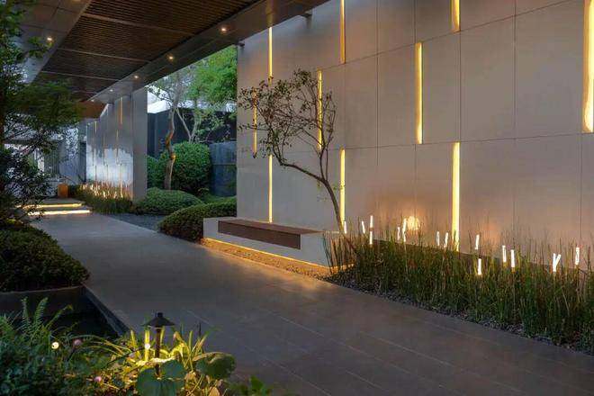 各式各样的艺术景墙映入眼帘,辅以仪式感排布的弯杆铁冬青树阵,树植掩映之间,呈现一幅热情且不喧闹的迎宾之姿,消弭城市喧嚣,礼遇进出的每一步。