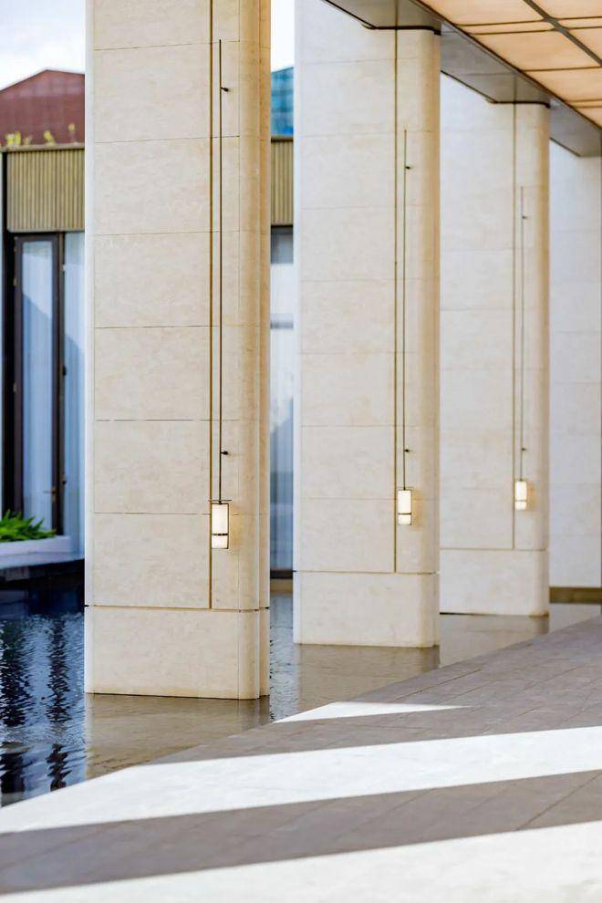 顶部定制发光云石亚克力与圆弧形的古铜色铝板交相辉映,8个西班牙宫殿沉香米黄石柱提升了尊崇感,漫步其间,揽风入怀,树影斑驳映入眼帘,水声潺潺入耳,归家的轻松感油然而生,笔者随手一拍,都非常的出圈。