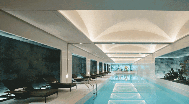 上海首个植物园泳池,以皮革面绿色石材营造树影斑驳的秘境氛围;