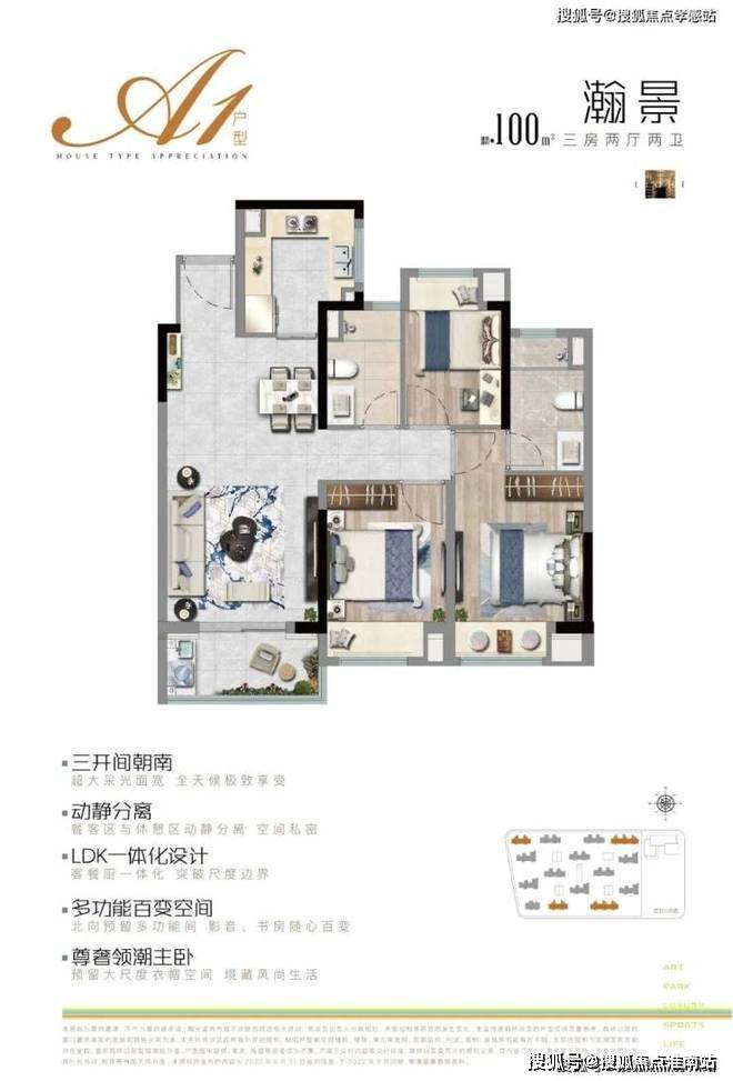 项目约100㎡3房2卫的户型把实用性做到了极致,总价虽低,但能满足业主从二人世界到二胎生活的全生命周期需求。