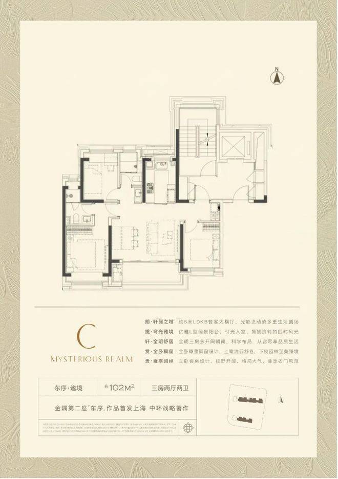 【约102㎡样板间】三房两厅两卫格局,同样的布局设计巧思应用于102㎡,打造出近乎双套房的生活体验。5米面宽横厅设计,营造极致通透感,臻选奢石融入空间,优雅时尚。厨房科学动线设计,搭配国际品牌五金和厨电,悦享精致烹饪时刻。星级主卧,独立卫浴,将空间最大程度延伸,打造舒居体验。