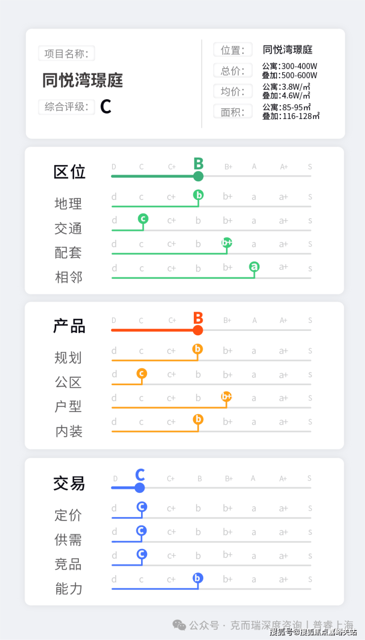 再来看产品评级B,其中规划与排布b,公区c,户型b+,内装b。